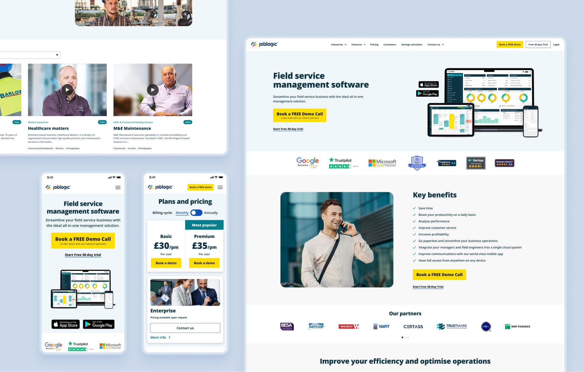 A significant part of the project involved designing landing pages that effectively capture user engagement, including email capture for demo bookings and platform sign-ups. The challenge was creating a flexible design system to accommodate components like price comparison tools, ensuring seamless functionality across mobile and desktop interfaces. Our solution was a robust, adaptable design system that streamlined Joblogic's web presence and reinforced its brand identity.